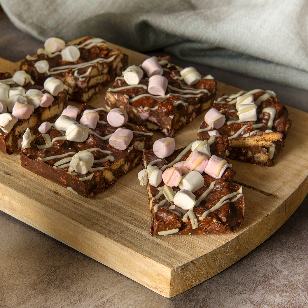 Enjoy our delicious Rocky Road Traybake - a Bryson's customer favourite! With a sinfully sweet, crunchy oaty base, super smooth milk chocolate, sticky marshmallow and crunchy peanuts, it's sure to tantalize your taste buds and leave you wanting more.